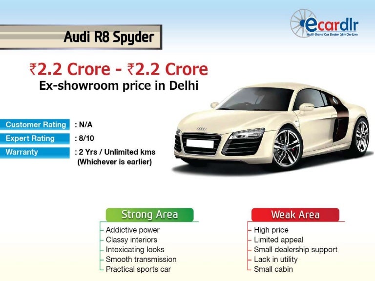 On this page, ccarprice is providing the best audi car prices in india. The q8 joins the a8 and r8 as the third flagship model of the audi range. Check details and reviews of audi r8, on road price, reviews, variants & photos. New audi a4 detailed review with on road price,features,interior | audi a4 india. See good deals, great deals and more on used 2010 audi r8. Compare prices of all audi r8's sold on carsguide over the last 6 months. Read about r8 on road price, reviews, variants & features. Use our free online car valuation tool to find out exactly how much your car is worth today. Buy audi r8 v10 plus in india | registered in 2017 & only 10800 kms driven. Audi has discontinued the r8 and the car is out of production. The site owner hides the web page description. Check the latest 2021 audi car prices in india, find new audi car models with full specs and features. Audi r8 2021 pricing, reviews, features and pics on pakwheels.