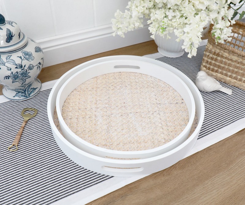 White woven round rattan tray, decorative trays, coffee table tray, breakfast in bed, round boho serving tray for table, straw serving tray javadeco 5 out of 5 stars (5) sale price $31.44 $ 31.44 $ 34.93 original price $34.93 (10% off. Sold and shipped by home basics. 1 out of 5 stars with 1 ratings. 4.3 out of 5 stars. In the bedroom, place in the middle of the bed and display a decorative breakfast tray setting with a small plate, cup and saucer and a small vase with a single flower inside.